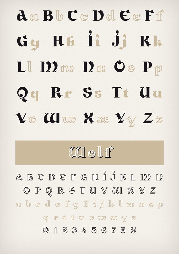 With Wolf we give this design, based on sharp gothic forms, a more human and nicer approach, loosely based on handwriting with a broad nibbed pen. The four fonts are based on four different layers which allows the users endless color combinations. Wolf is perfect for designing logo's, headings or display typography.