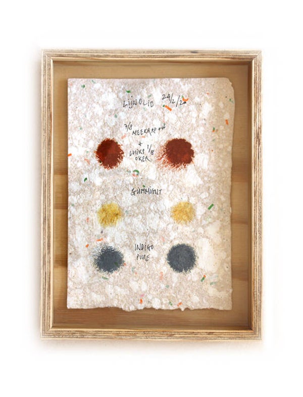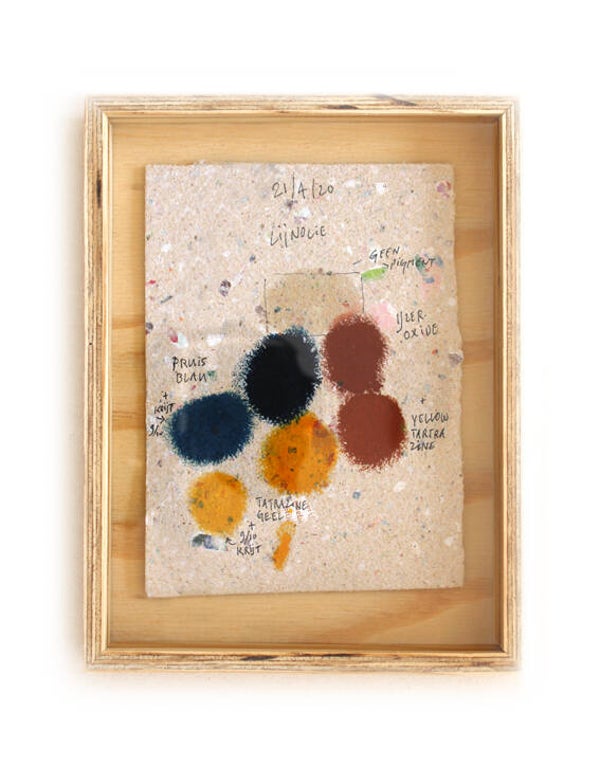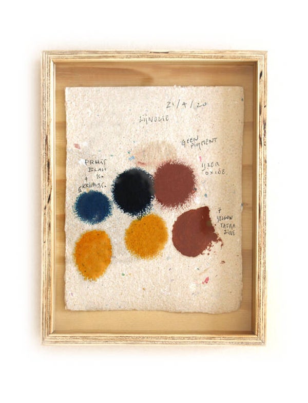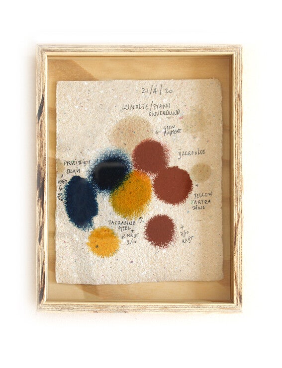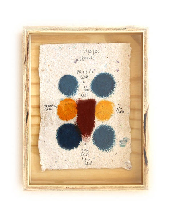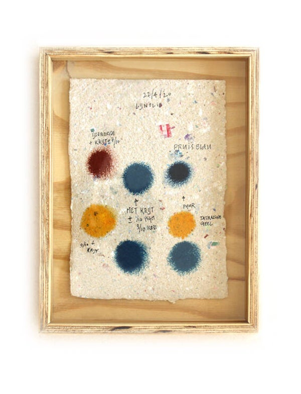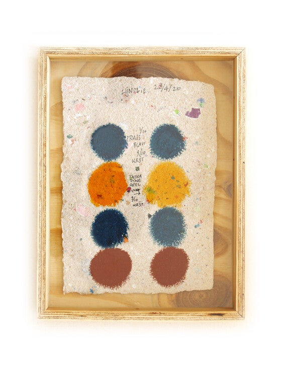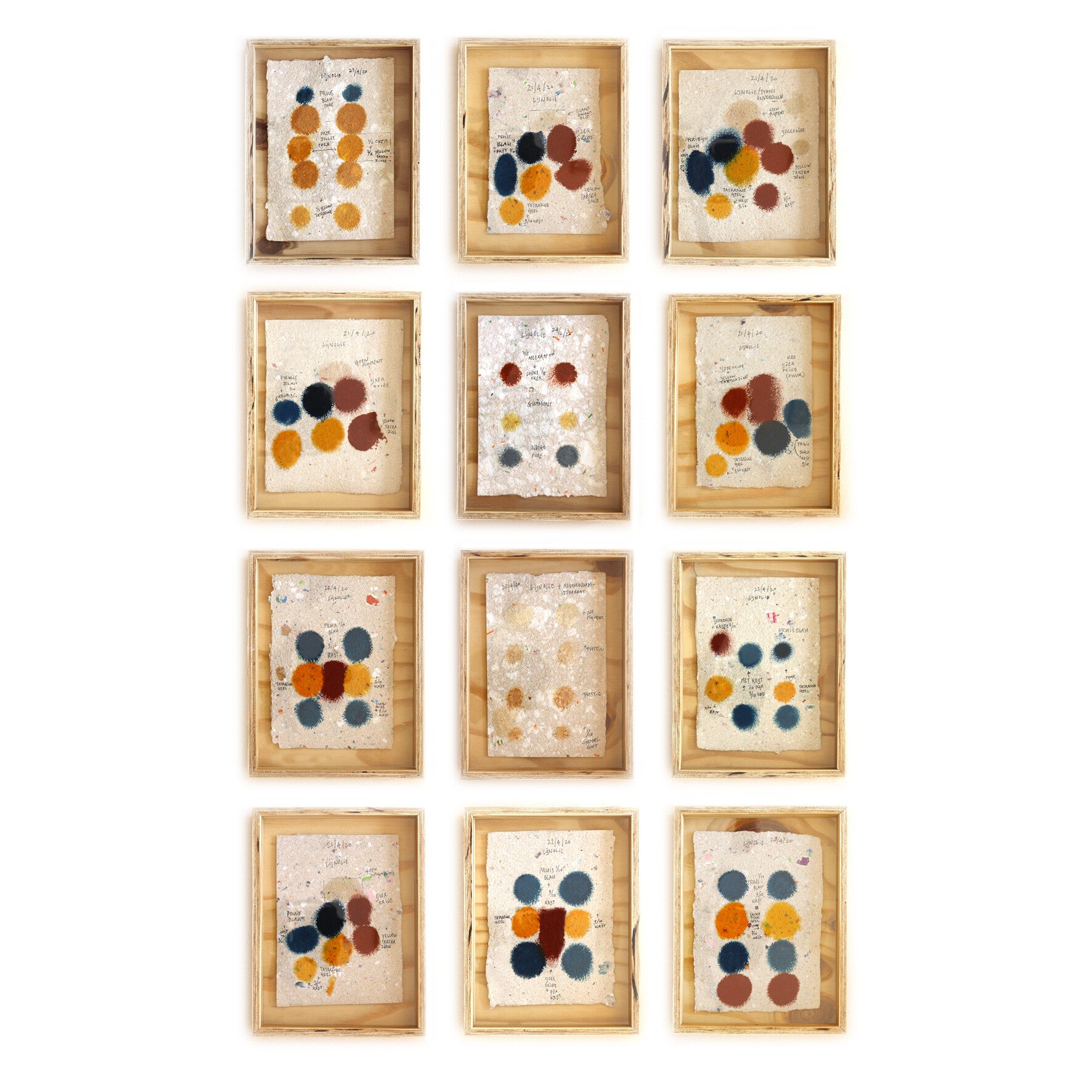 Novo Typo Offgrid Color Test (2022) is a set of 12 unique prints (size 25 x 19 x 3,5 cm) numbered and signed by Mark van Wageningen. Handmade paper with handmade ink and framed in a handmade plywood box.